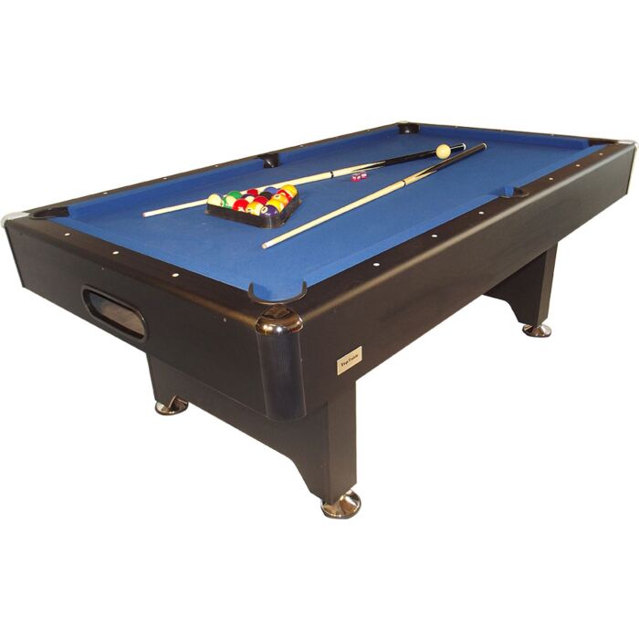 Strakke vormgeving met metalen hoekstukken, een stevig basisframe met een 20 mm dik speelveld, kwaliteit stootbanden en een goed poollaken met wel 60% wol! staan garant voor uren en uren speelplezier. Deze stoere pooltafel heeft verstelbare poten, zodat het speelveld mooi uitgebalanceerd kan worden. Deze luxe pooltafel is uitgevoerd met een ball-return.