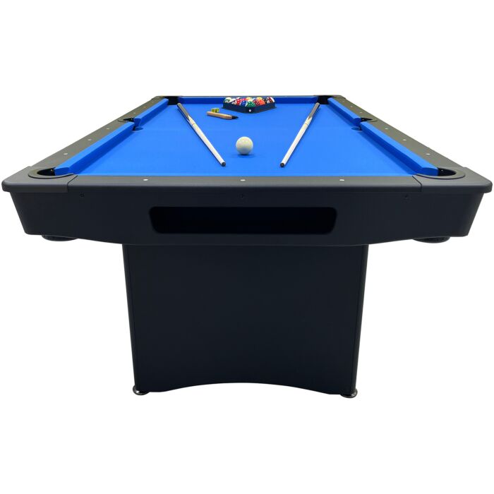 Deze 7ft uitvoering van de Challenger pooltafel heeft een modern club design uitgevoerd in zwart met blauw laken en is uitgerust met inklapbare poten. Dit maakt de tafel ideaal voor kleinere ruimtes, omdat je hem eenvoudig kunt opbergen om ruimte te besparen. Voor het beste speelcomfort adviseren wij een minimale ruimte van 488 x 394 cm.