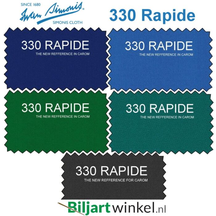 Het Simonis 330 Rapide biljartlaken is de officiële opvolger van het Simonis 300 Rapide en biedt verbeterde snelheid zonder concessies te doen aan balcontrole en duurzaamheid. Dankzij de speciale weeftechniek is dit laken sneller dan zijn voorganger en zorgt het voor een optimale speelervaring. Het Simonis 330 Rapide is het nieuwe wedstrijdlaken van de wereldbond UMB en dé favoriet onder professionele spelers in carambole biljart en artistiek biljart.